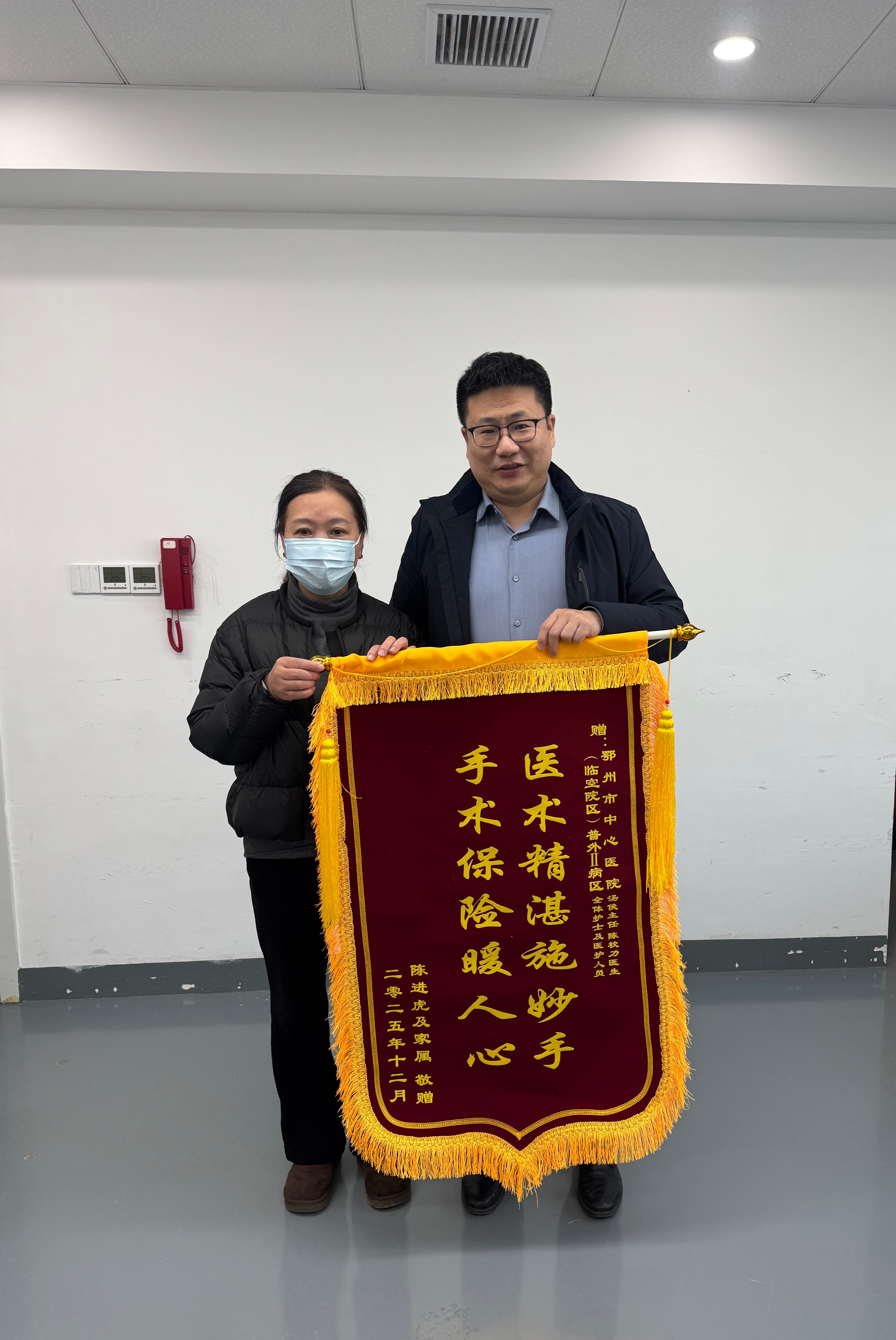 2025年12月27日,鄂州市中心醫(yī)院普外Ⅱ病區(qū)暖意融融,患者家屬將一面印著“醫(yī)術(shù)精湛施妙手,手術(shù)保險(xiǎn)暖人心”的錦旗,鄭重送到湯俊主任、陳校力醫(yī)生及湖北大同保險(xiǎn)武漢二公司駐院工作組手中,以此致謝醫(yī)護(hù)人員的精湛醫(yī)術(shù)與暖心照料,以及手術(shù)險(xiǎn)為家庭減輕的經(jīng)濟(jì)負(fù)擔(dān)。